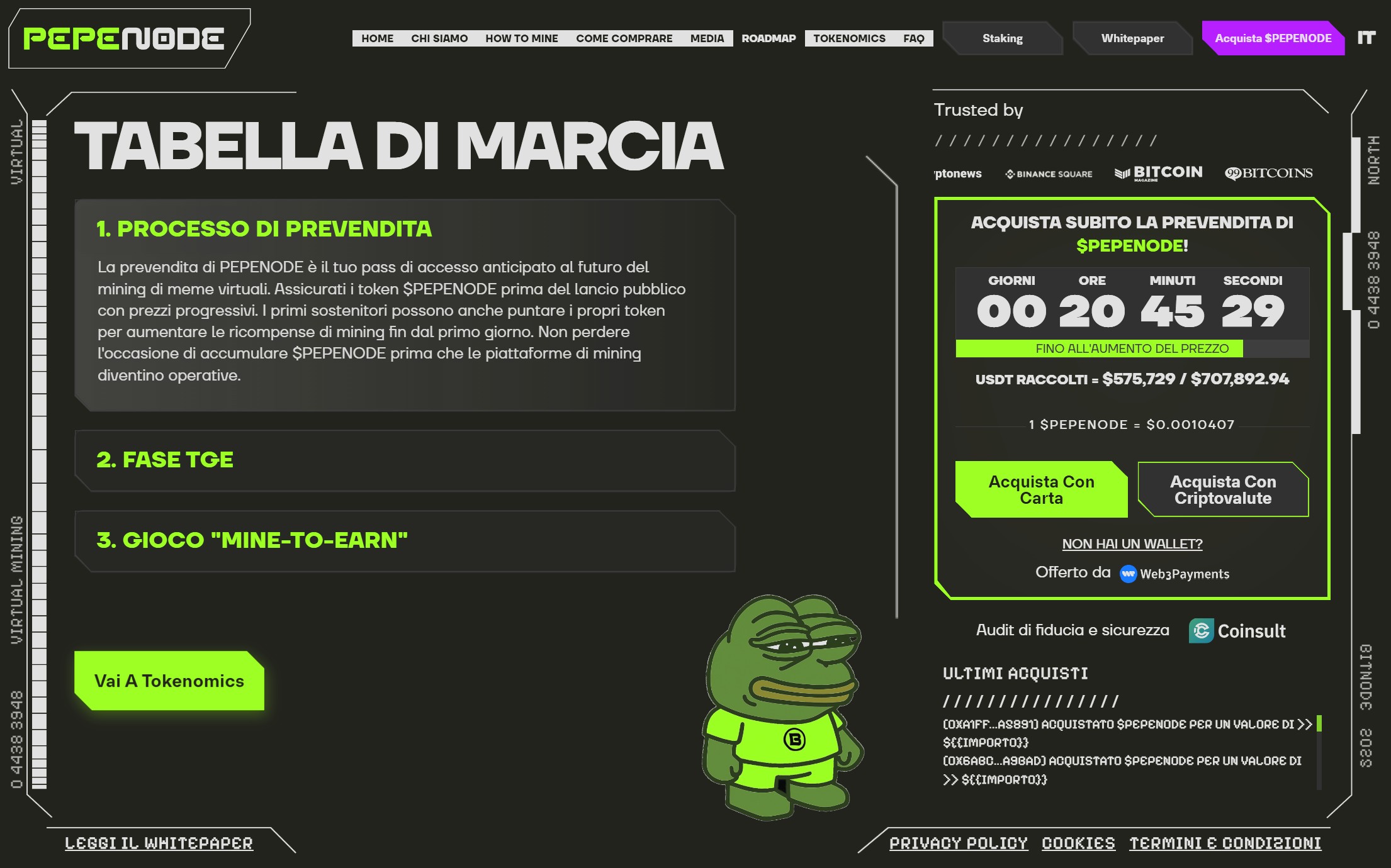 La prevendita di PEPENODE ha già raccolto 576.000 dollari in pochi giorni. È la prima volta che una meme coin permette di creare il proprio rig di mining virtuale, acquistare nodi, creare il proprio server e ottenere rendimenti passivi.