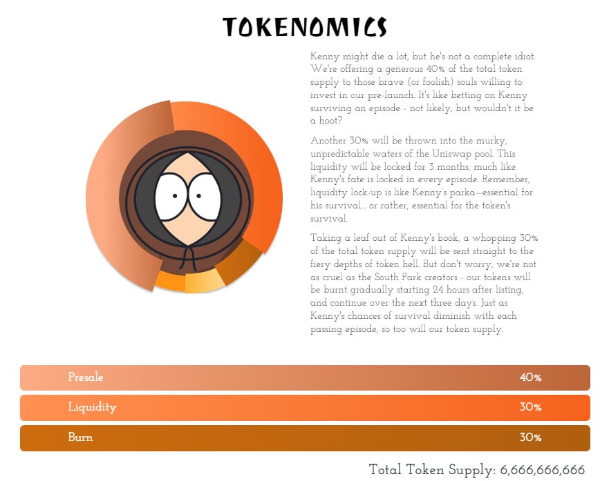 La prevendita ha messo a disposizione solo il 40% dell’offerta totale del token $KENNY, per un valore totale di 500.000$. L’ideale per scaldare l’ambiente e mantenere alto l’hype in vista del lancio su DEX.