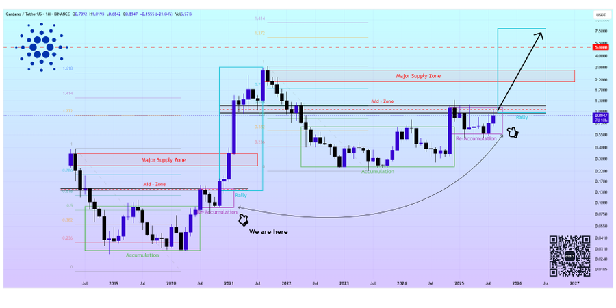 Secondo il grafico da lui condiviso, ADA si muove attualmente al di sotto della zona macro mediana di 1,00-1,20 dollari, con resistenza nella zona di offerta di 2-3 dollari, lo stesso livello che ha frenato il rally nel ciclo precedente.