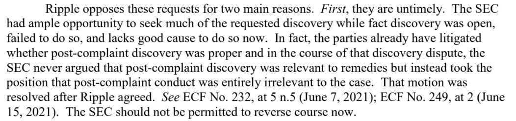 Dopo la richiesta di proroga fino al 19 gennaio per rispondere alla mozione della SEC, il team legale di Ripple ha presentato una risposta nella quale si oppone al termine concesso e chiede alla corte di respingere le richieste dell’agenzia governativa, sostenendo che sono intempestive e ingiustificate.