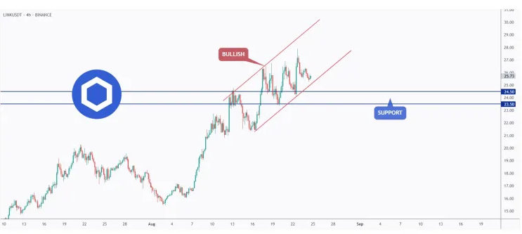 Secondo AltCryptoTalk, LINK continua a muoversi all’interno di un canale ascendente sviluppatosi nelle ultime due settimane. Nonostante la rottura del supporto a 25 dollari, il token resta all’interno di un’area tecnica chiave. Finché il prezzo si mantiene al di sopra dei 23,5 dollari, la struttura rialzista può ancora essere considerata intatta. Questa interpretazione, condivisa da diversi analisti, suggerisce che eventuali ribassi temporanei potrebbero rappresentare opportunità di acquisto in ottica trend-following.