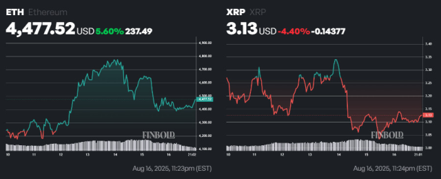È interessante notare che entrambi gli asset hanno mostrato un forte slancio nel 2025, rompendo importanti livelli di resistenza. Al momento, ETH viene scambiato a 4.477 dollari con una capitalizzazione di mercato di 540 miliardi di dollari, mentre XRP è valutato a 3,13 dollari, con una capitalizzazione di 185 miliardi di dollari.