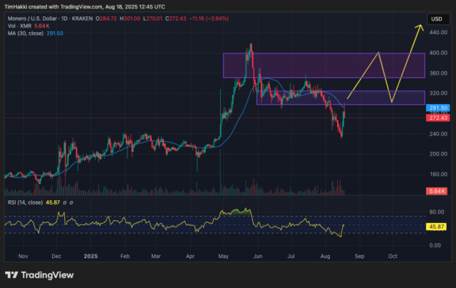 Inoltre, il grafico mostra un forte aumento dell’RSI, a indicare un crescente momentum di acquisto. Se questo dovesse trasformarsi in una rally, XMR potrebbe salire fino a $400, dove probabilmente incontrerebbe resistenze. Poiché il supporto si trova poco sopra i $300, è comunque possibile che un mercato toro porti a un nuovo ATH (con quello attuale che è di $542,33, stabilito nel 2018).