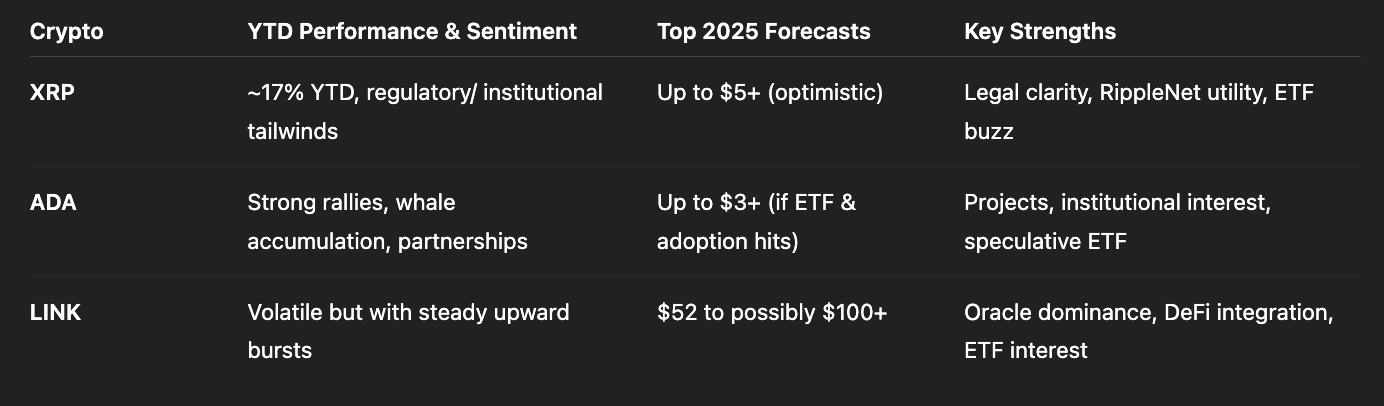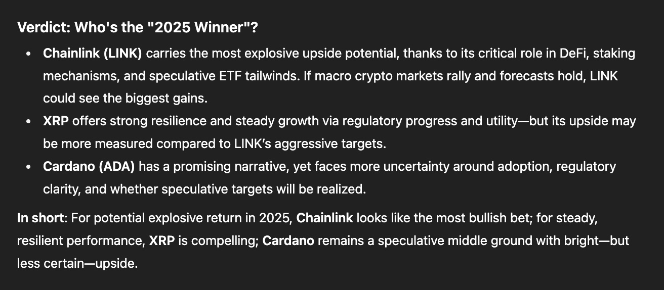 Secondo l’ultima analisi dello strumento AI di OpenAI, ChatGPT, nel 2025 XRP, Cardano (ADA) e Chainlink (LINK) sono destinati a registrare forti movimenti di prezzo. Tra le altcoin consolidate che promettono una crescita sana, ChatGPT vede Chainlink come la favorita.