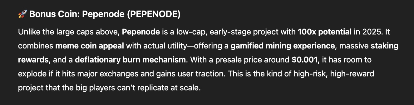 Oltre agli operatori affermati, ChatGPT cita un outsider con un potenziale eccezionale: PepeNode. Questo progetto combina il fascino delle meme coin con una reale utilità.