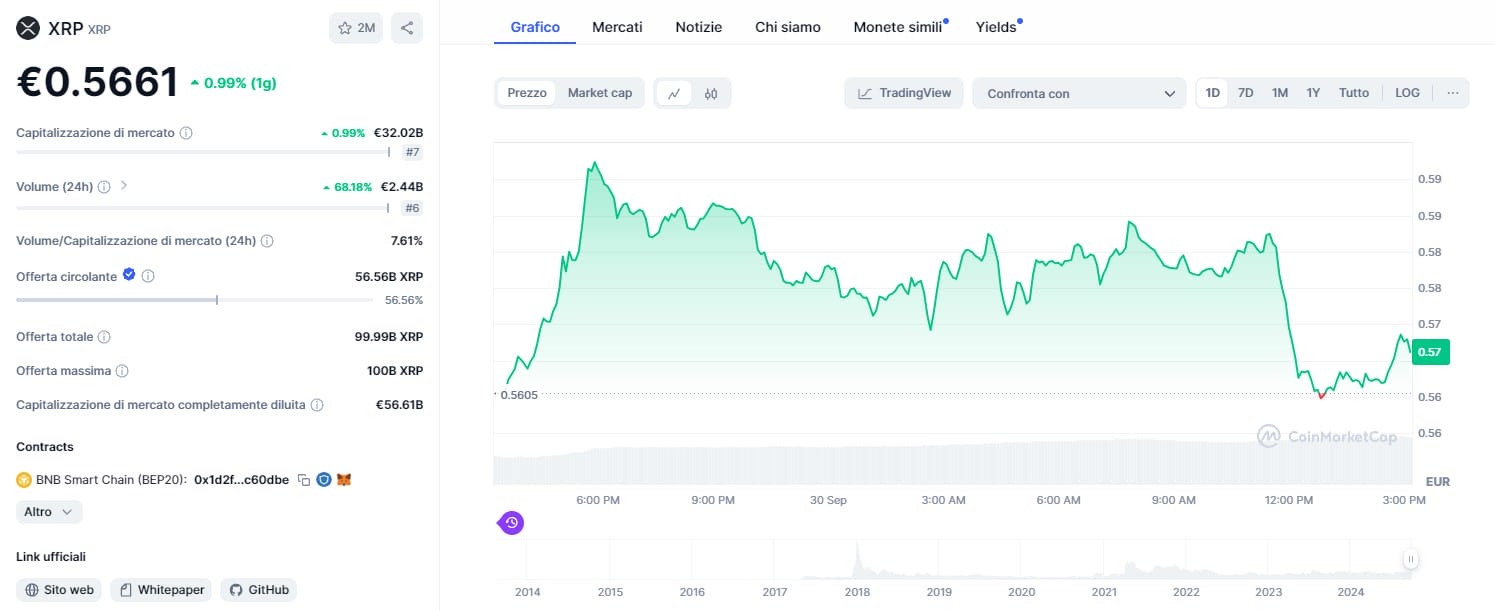 Secondo i dati di CoinMarketCap, raccolti al momento della stesura del nostro articolo, XRP è scambiato al prezzo di 0,56 dollari. Il token è salito dello 0,99% nelle ultime 24 ore e da mesi sta lottando per superare la barriera di 0,60 dollari.