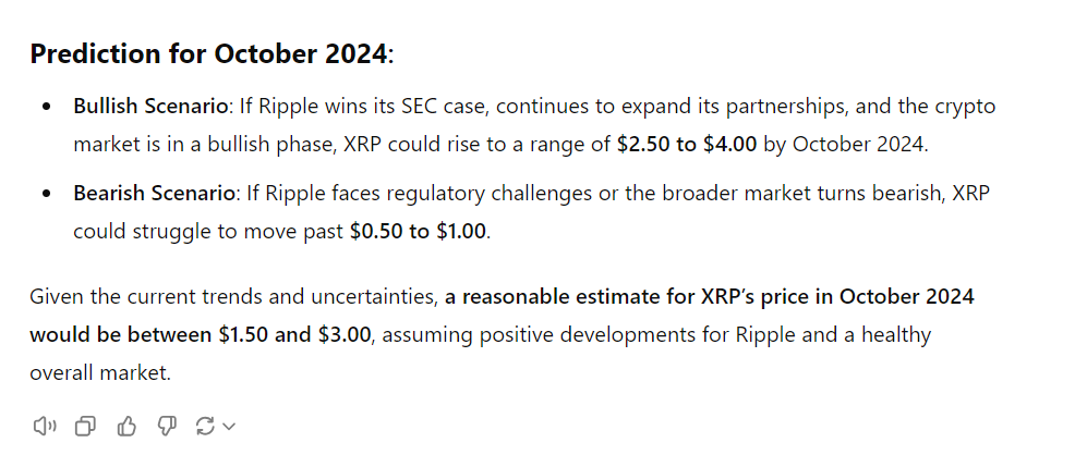 Lo strumento di previsione AI ChatGPT ha delineato una nuova analisi dei prezzi di XRP per ottobre 2024. La piattaforma ha formulato previsioni di prezzo ambiziose per il token di Ripple, a condizione che il mercato mantenga la sua attuale tendenza rialzista.