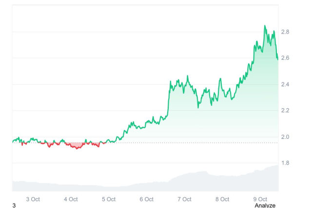 Il prezzo di MNT ha registrato un aumento impressionante, con un rally di oltre il 30% nell’ultima settimana e un nuovo massimo storico vicino ai 2,85 dollari.