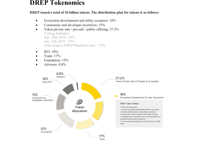 DREP ha iniziato con 10 miliardi di DREP, che equivalgono al 100% dell’offerta totale di token. Una certa quantità è stata offerta al pubblico attraverso vari eventi di vendita e distribuzioni. Il 17,8% dell’offerta totale di token è stato assegnato al team e ai consulenti, il 15% alla comunità degli sviluppatori, il 18% allo sviluppo dell’ecosistema e il 17,55% alla riserva della fondazione.