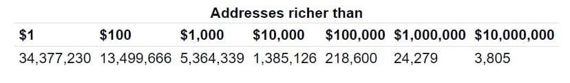 Nello specifico, tra questi wallet milionari, 70.747 indirizzi hanno un saldo in Bitcoin che supera il milione di dollari. Ben 5.331 wallet possiedono almeno 10 milioni di dollari in BTC.
