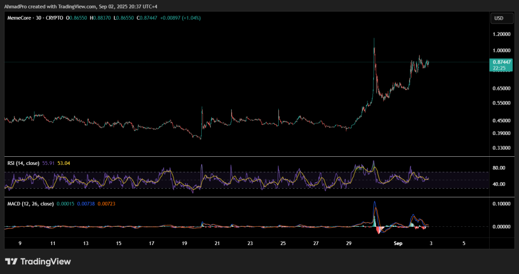 MemeCore si avvicina a una capitalizzazione di mercato di 1 miliardo di dollari e ha appena raggiunto il massimo storico di 0,87 dollari. Non sembra che lo slancio stia rallentando e il grafico riflette la forza dell’ecosistema.
