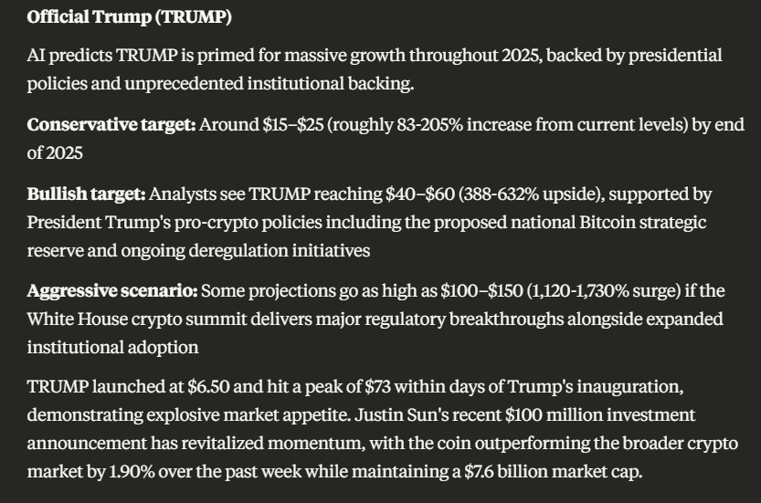 La meme coin TRUMP dopo il lancio del token WLFI: Claude prevede 15 dollari entro la fine del 2025