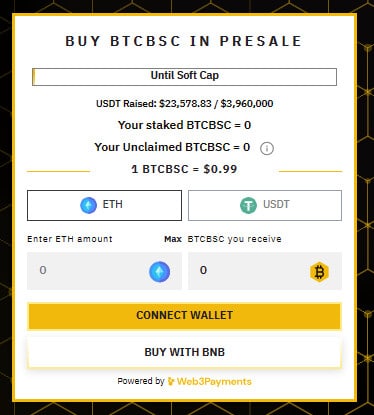 Successivamente, gli investitori dovranno caricare le criptovalute nei loro wallet, in modo da poterle utilizzare per acquistare i token BTCBSC.