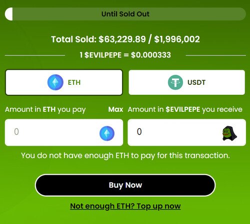 Il token EVILPEPE può essere pagato esclusivamente con token ETH (Ethereum) o USDT (Tether). Gli investitori che sono sprovvisti di queste criptovalute, possono acquistarle con moneta fiat attraverso un qualsiasi exchange centralizzato (CEX).