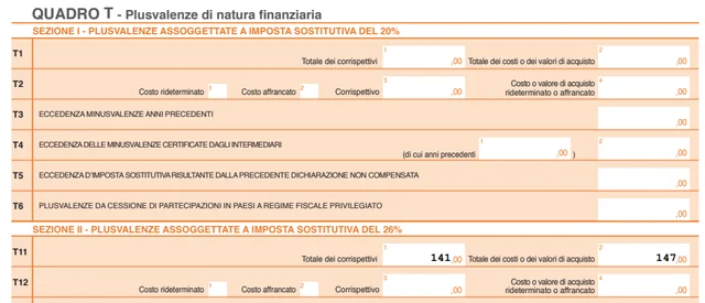 - Compila il quadro RT: qui si indicano le plusvalenze realizzate nell’anno.