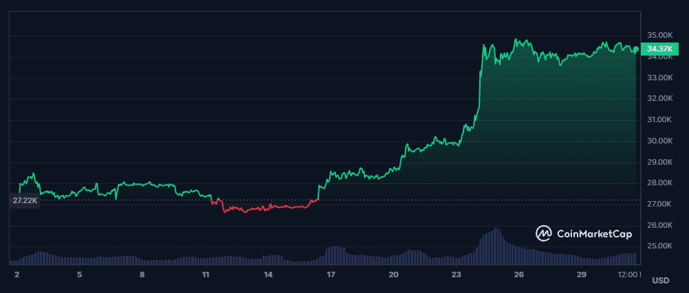 Durante il recente rally del mercato, Bitcoin ha ottenuto un significativo vantaggio su tutte le altre criptovalute. Ha raggiunto un picco di 35.300 dollari e ha superato Ethereum, grazie a un aumento del 30% nel mese, rispetto all’8% di ETH.