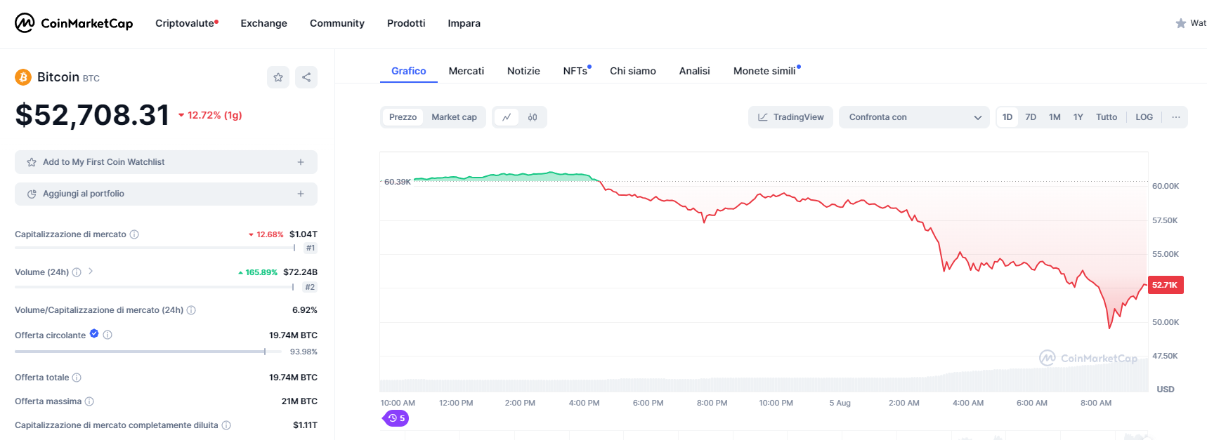 Bitcoin perde il 12% nel momento in cui scriviamo ma la caduta è stata fragorosa, visto che in meno di 24 ore è passato da 60.000 a 50.000 dollari, anche se poi si è ripreso leggermente. In una settimana BTC ha perso il 24%, tornando ai valori di un mese fa.