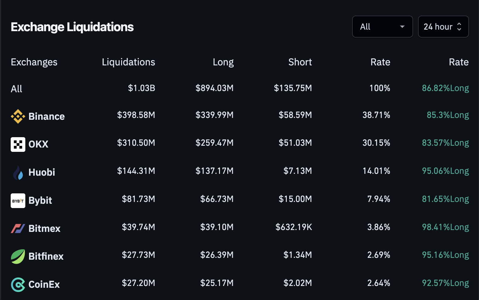 Secondo i dati di Coinglass, le liquidazioni totali nelle ultime 24 ore hanno raggiunto 1,03 miliardi di dollari, di cui 894,03 milioni di dollari erano su posizioni (long) lunghe. Solo nell’ultima ora sono stati liquidati quasi 150 milioni di dollari.