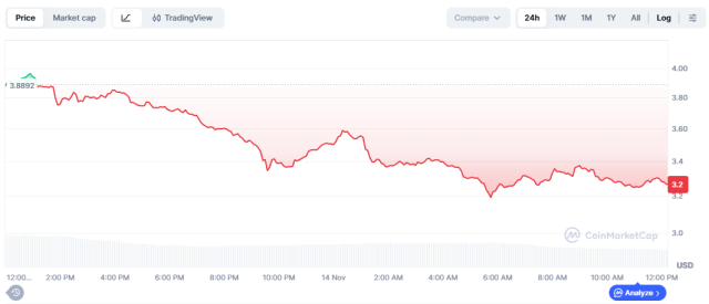 Story registra il ribasso più marcato della giornata con una perdita del -14%, portando il prezzo a $3,30. Il volume di scambio nelle ultime 24 ore si attesta a $102,5 milioni, segno di un’intensa attività di trading durante questa fase di correzione.