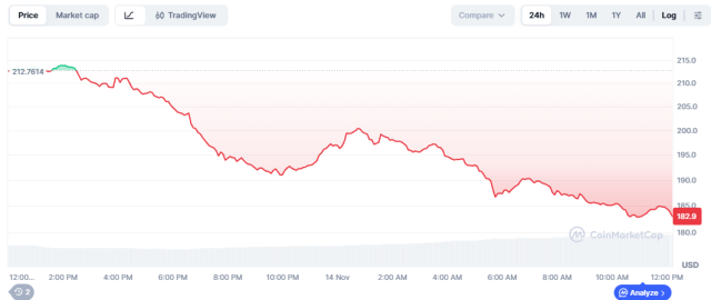 Aave, uno dei protocolli di finanza decentralizzata più affermati, subisce un ribasso del -13%, con il prezzo che scende a $184,96. Il dato più significativo è il volume di scambio giornaliero che raggiunge $625,9 milioni, il più alto tra le tre criptovalute analizzate.