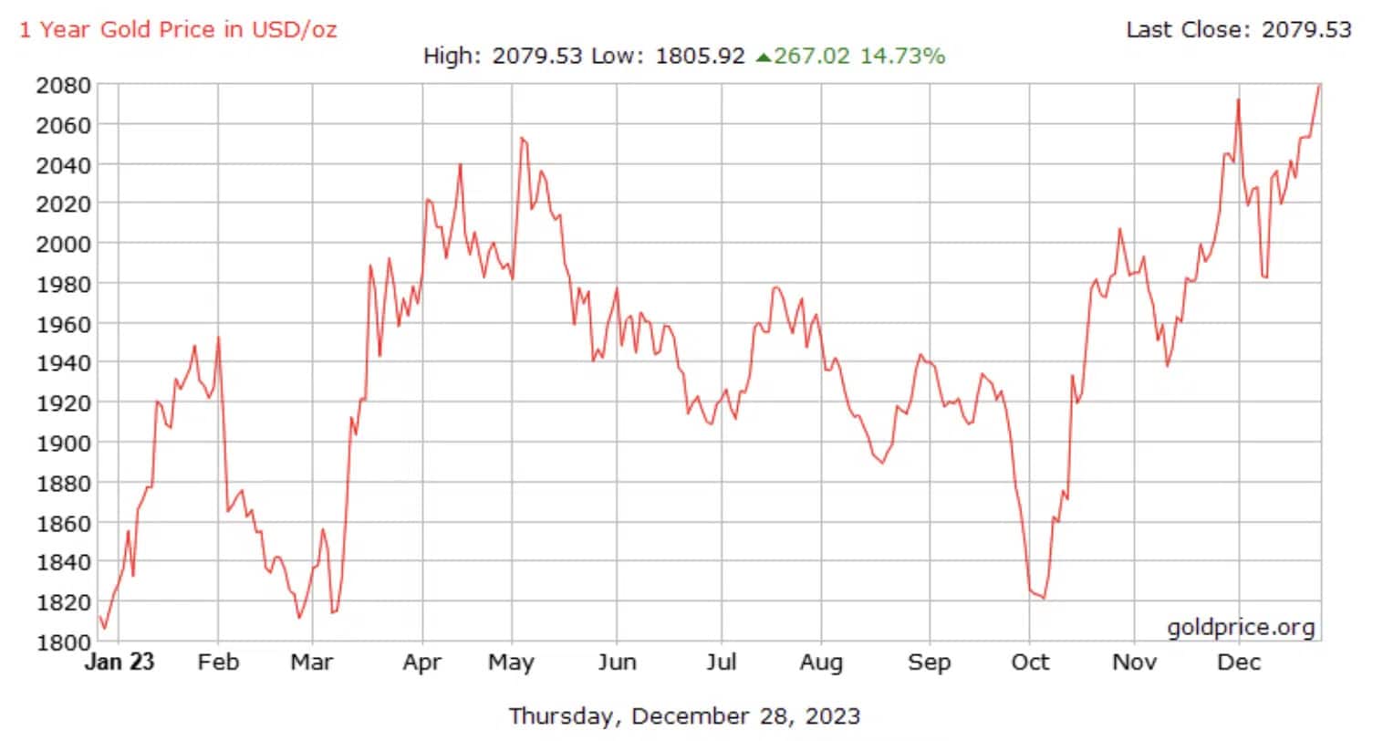 I prezzi del metallo prezioso hanno raggiunto il massimo a dicembre, fino a toccare 2.150$ l’oncia. Una crescita del 13,3% in 12 mesi.