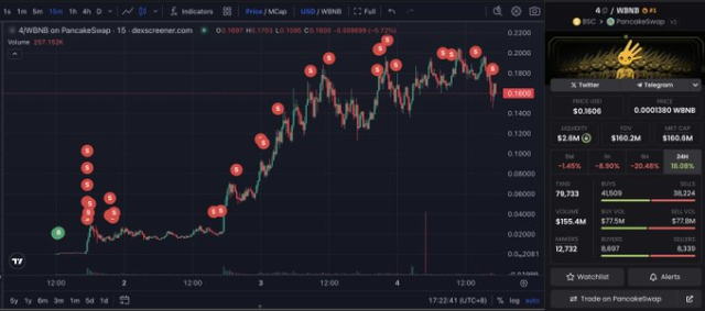 Il token $4 ha registrato un’attività di trading esplosiva. In 24 ore, ci sono state oltre 79.000 transazioni e il volume di trading ha superato i 155 milioni di dollari.
