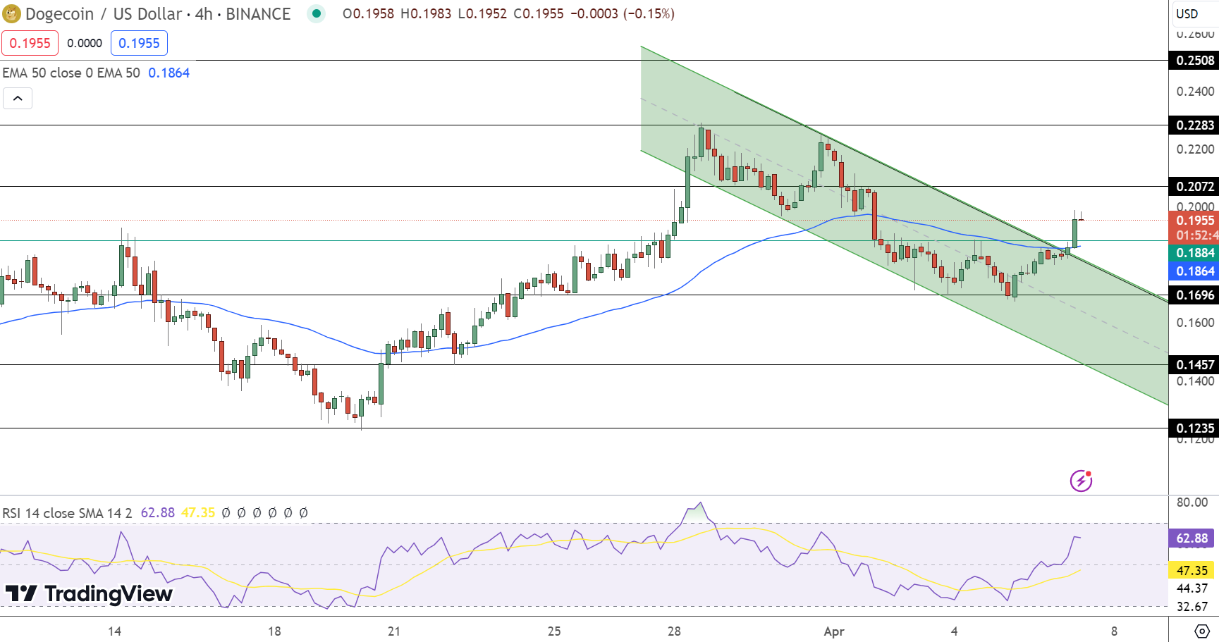 La recente performance di Dogecoin mostra una rottura rispetto al precedente canale al ribasso, che trova una resistenza vicino al livello di 0,1885 dollari. La possibilità che il trend continui a essere rialzista dipende dalla capacità dell’asset di mantenere il prezzo al di sopra di questo punto. Il quadro attuale sembra essere sostenuto dai segnali positivi provenienti da RSI ed EMA.