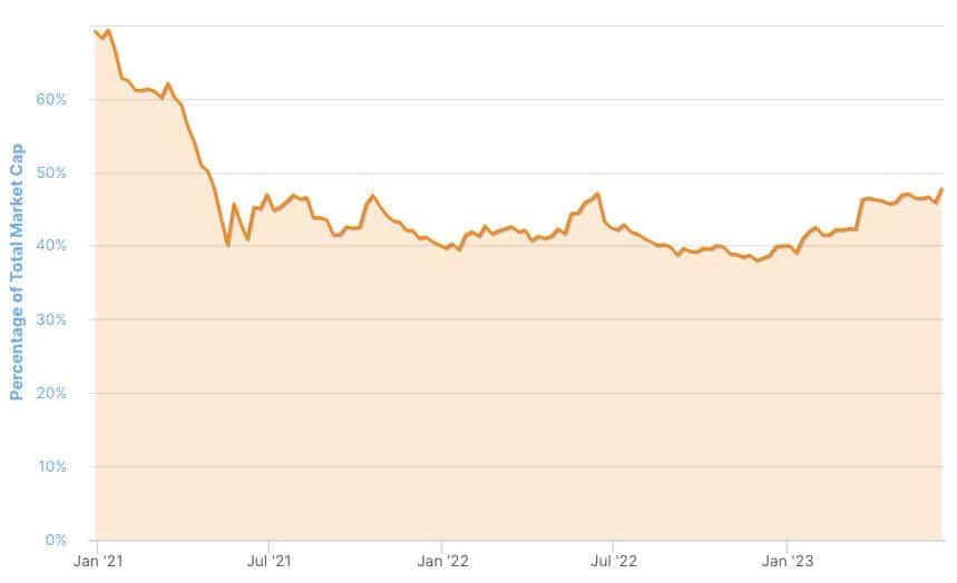 Attualmente la Bitcoin dominance si attesta al 47,8%, appena al di sotto del picco temporaneo raggiunto nel luglio 2021 (48,2%).