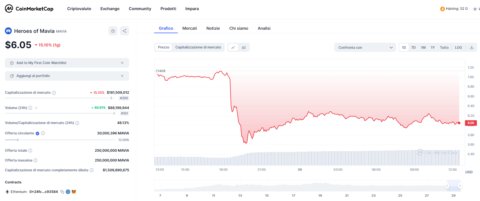Un altro token che non ha reagito alla corsa di Bitcoin e, al contrario, è sceso di valore, è MAVIA. Come si può ben vedere nel grafico, MAVIA è sceso ieri durante la corsa di BTC e non si è ancora ripreso. Per VirtualBacon si tratta di un’opportunità interessante di ingresso, soprattutto a questo prezzo, intorno ai 6 dollari.