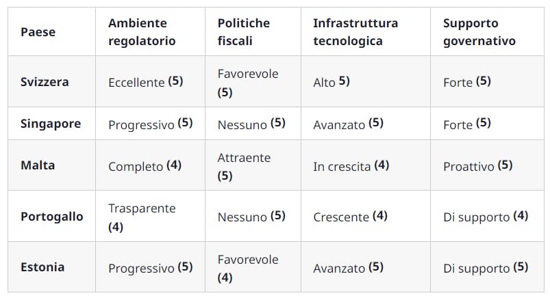 Per esempio, mentre la Svizzera e Singapore offrono ecosistemi maturi, i nuovi arrivati come Malta e il Portogallo stanno rapidamente facendo passi da gigante, ma potrebbero avere problemi di crescita.