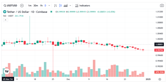 USDT, progettato per mantenere un valore ancorato 1 a 1 al dollaro statunitense, è stato scambiato a $0,997 al momento della stesura, raggiungendo un minimo di due anni per la stablecoin.