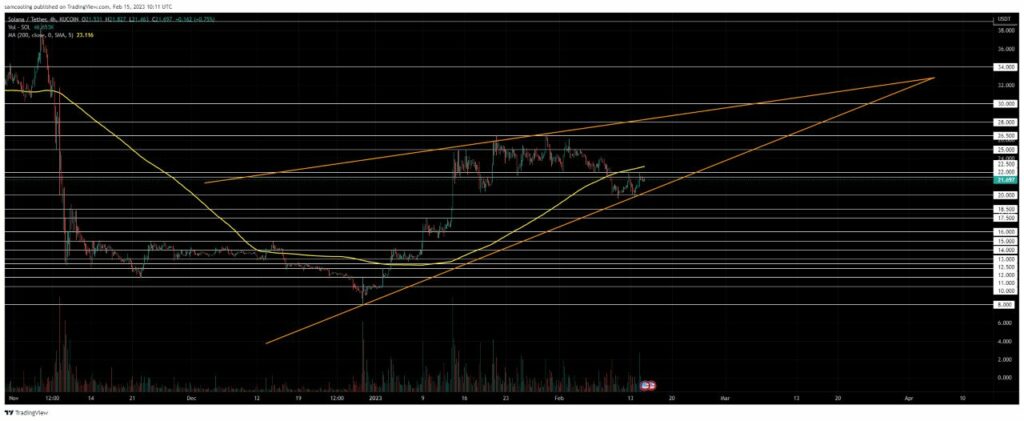 Ma alcuni temono che il rally di SOL stia per esaurirsi. L’inizio di febbraio, infatti, ha visto il token martellare per settimane contro la resistenza chiave a 22,50 dollari. Il conseguente ritracciamento è stata un’operazione disordinata durata 10 giorni. Il 9 febbraio, il prezzo di Solana è sceso criticamente al di sotto della solida media mobile a 200 giorni.La struttura del grafico del rally è rimasta inalterata, in quanto i tori hanno frettolosamente raggiunto il supporto a 20,00 dollari. Tuttavia, SOL non è fuori pericolo. Al momento è intrappolata in un modello di oscillazione consolidato tra la media mobile a 200 giorni e la linea di tendenza inferiore, di vitale importanza. Questa pericolosa disposizione pendolare sta per essere forzata; la resistenza locale della media mobile a 200 giorni dovrà essere per forza sfondata affinché il rally possa riprendere.Un breakout al rialzo al di sopra della media mobile a 200 giorni vedrebbe la ripresa del rally con un test a 22,50 dollari. Se questo tetto dovesse cedere, i prezzi si impennerebbero fino a circa 26,00 dollari.Un crollo da qui, invece, sarebbe devastante per la struttura del rally, perché i prezzi potrebbero crollare fino al supporto più vicino a 16,00 dollari.