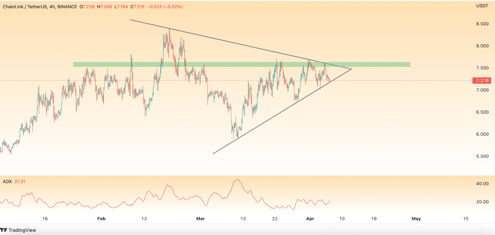 Il prezzo di LINK è molto vicino all’apice del consolidamento simmetrico, che di solito è considerato decisivo. Nel frattempo, l’ADX, che indica la forza del rally, sta lentamente aumentando, quindi il prezzo potrebbe subire un breakout rialzista molto presto.