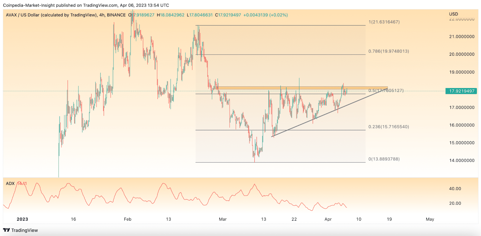 Anche il prezzo di Avalanche si sta consolidando all’interno di un triangolo ascendente, ma è riuscito a superare il blocco orizzontale a 17,78 dollari. Il prezzo ha ritracciato più in basso a causa delle prospettive ribassiste a breve termine, quindi al momento sta scambiando lungo i livelli di resistenza intermedi.