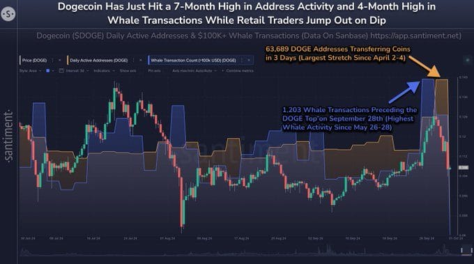 Inoltre i dati di Santiment rivelano che, nonostante il recente calo di DOGE, le whale continuano a essere interessate alla meme coin. Ad esempio, prima del picco del 28 settembre, ci sono state 1.203 transazioni delle balene, ognuna oltre i 100.000 dollari, il numero più elevato registrato da maggio.