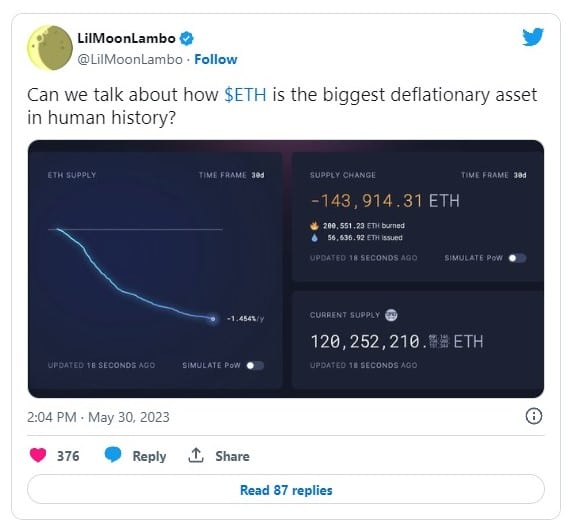 Oltre a ciò, il passaggio allo staking (che ha ridotto l’emissione di nuovi token) e l’introduzione delle commissioni di burning (tramite l’EIP-1559) significa che Ethereum ha ora la tendenza a sgonfiarsi a seconda di quanto diventa movimentato.