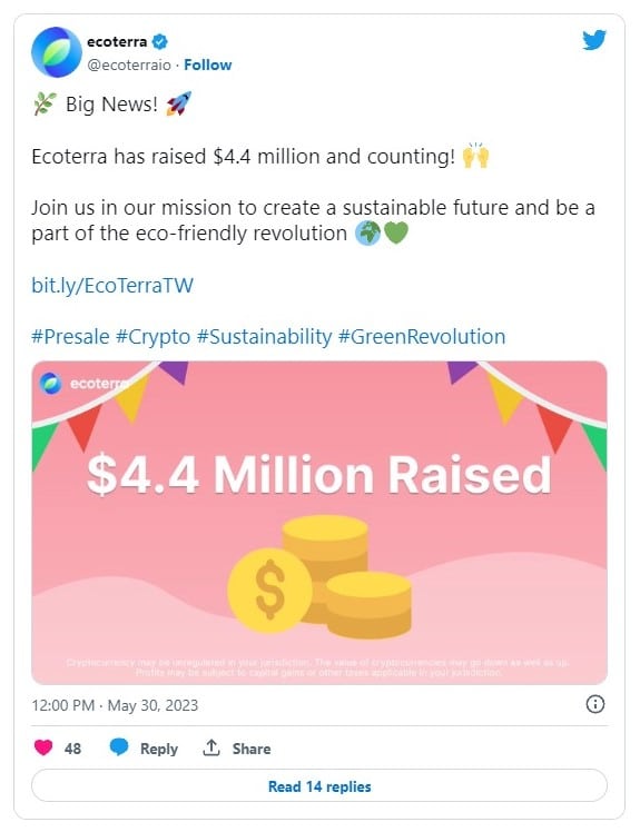 Questo prezzo salirà a 0,001 dollari quando la prevendita terminerà nelle prossime settimane; successivamente, il prezzo di ECOTERRA potrebbe salire ulteriormente dopo essere stato quotato dagli exchange.