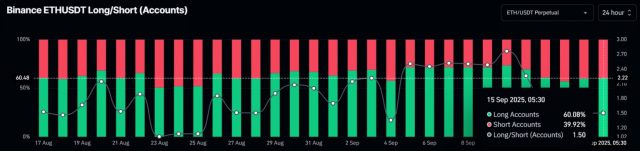 Secondo i dati sui future di Binance, il rapporto long/short su ETH/USDT è intorno a 1,50: significa che circa il 60% dei trader scommette su un rialzo del prezzo di ETH, mentre il 40% punta sul ribasso.