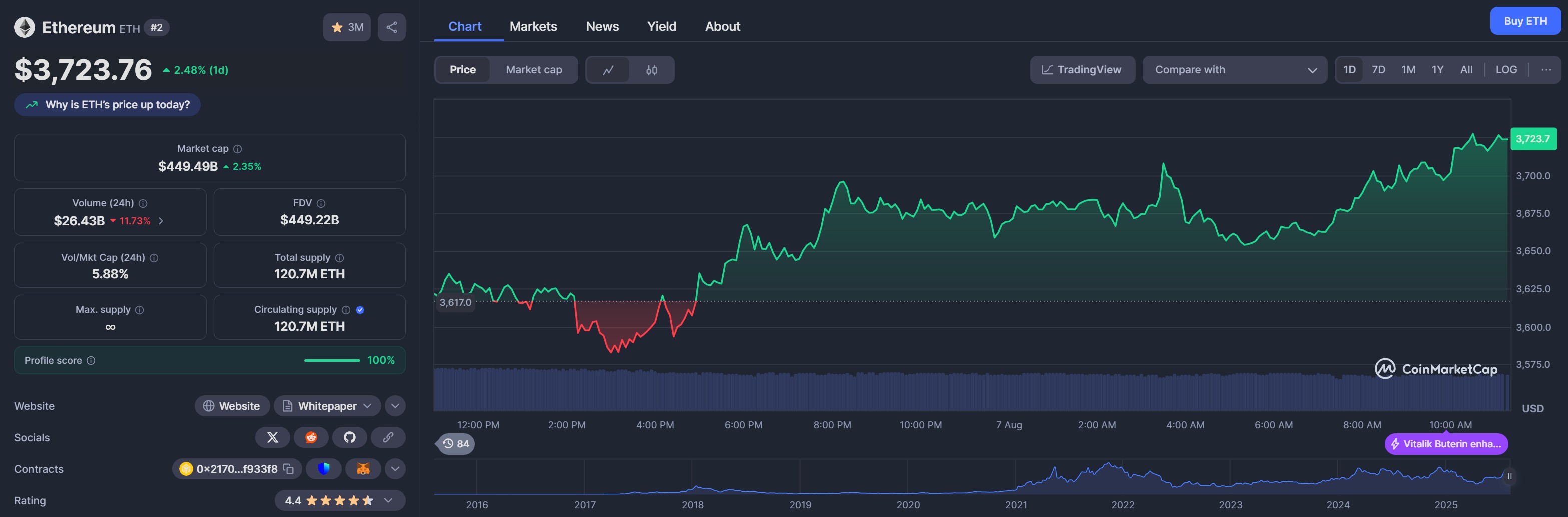 Nel frattempo la società di mining di Bitcoin, BitMine Immersion Technologies, ha rivelato che le sue partecipazioni in ETH hanno superato gli 833.000 token, rendendola il più grande detentore aziendale conosciuto dell’asset digitale. Al momento della pubblicazione, ETH viene scambiato a 3.723 dollari, con un aumento del 2,48% nelle ultime 24 ore.