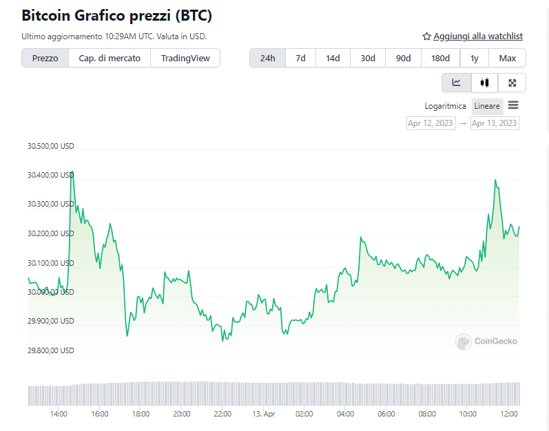 Anche Bitcoin ha avuto un andamento simile con un balzo verso le 10.30 che lo ha portato fino a 30.400 dollari, salvo poi ritracciare leggermente.