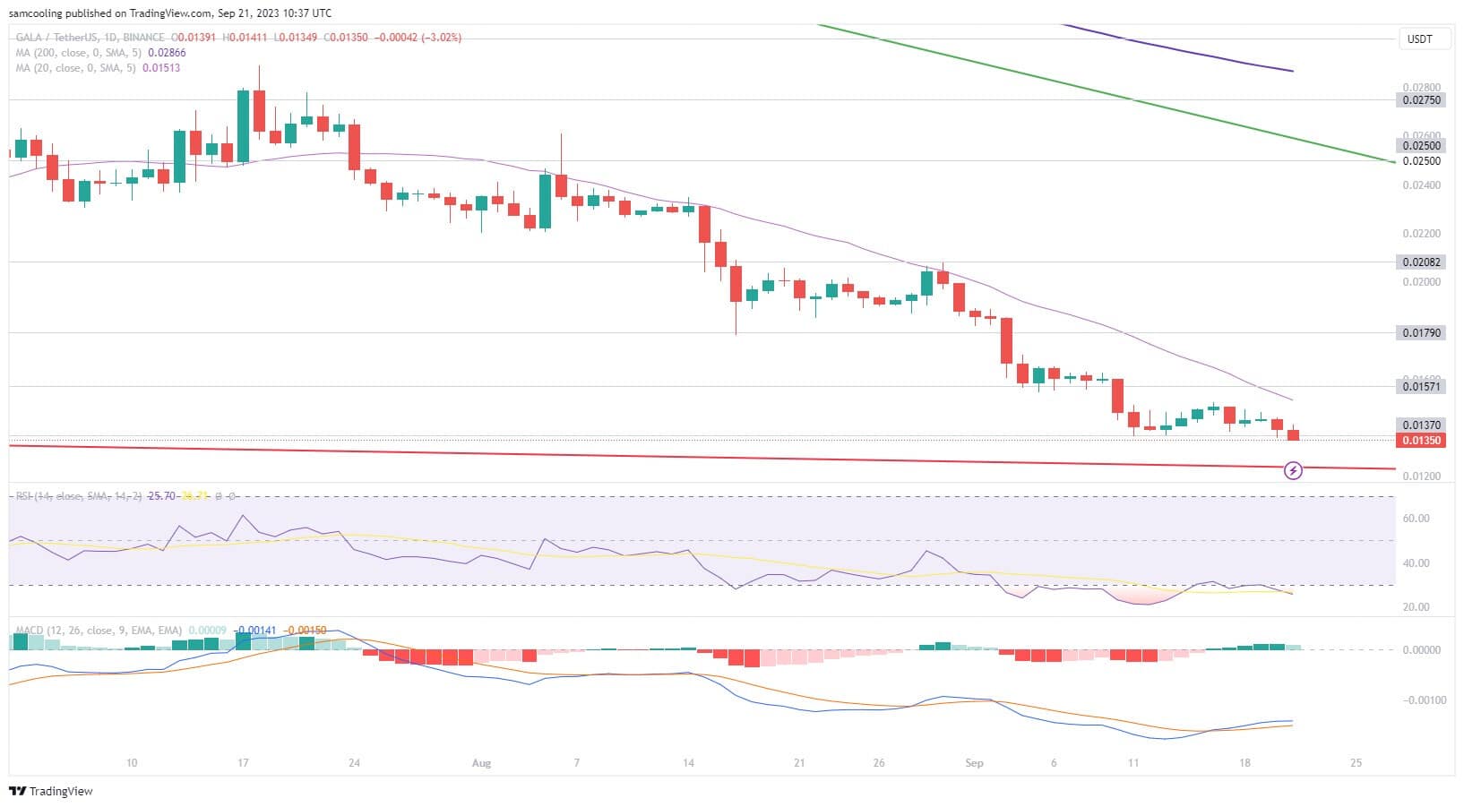 Mentre l’azione dei prezzi continua a inanellare nuovi minimi storici, Gala Games è scambiata in basso nel canale a 0,013$ con una variazione in 24 ore del -2,59%.