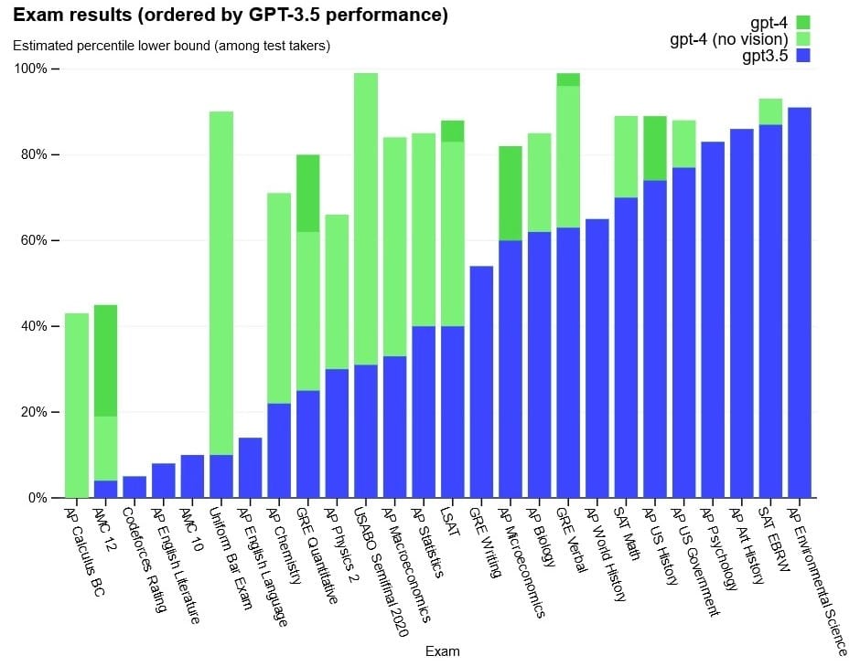 Tuttavia, il suo punteggio in Calcolo AP è stato abbastanza mediocre, collocandosi tra il 43° e il 59° percentile. Un’altra area in cui il GPT-4 è risultato carente è stata quella degli esami di letteratura inglese, con punteggi compresi tra l’8° e il 44° percentile in due test separati.