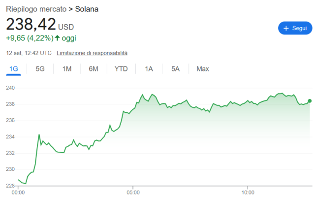 Solana rimane una delle altcoin leader nell’innovazione, con un mercato che riflette solidità tecnica e crescente ingresso di capitali istituzionali. I grafici mostrano che il supporto a 200 euro si è consolidato come livello strategico, difeso più volte dagli acquirenti.