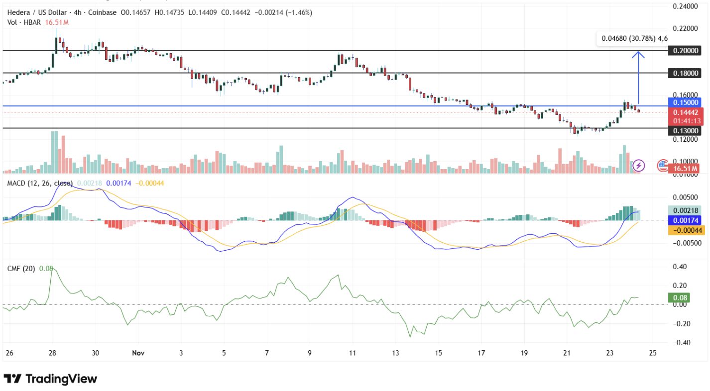Dopo il forte rally, HBAR si sta mantenendo intorno a 0,145 dollari. Il quadro tecnico resta positivo, dato che diversi segnali mostrano che i compratori stanno riprendendo il controllo.
