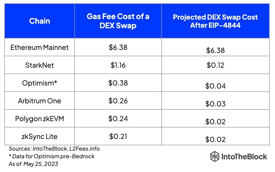 Come mostra questa tabella di IntoTheBlock, l’aggiornamento Dencun porterà a una riduzione pazzesca delle commissioni dei layer 2. E non parliamo di un dimezzamento, ma di un abbassamento del 90% circa.