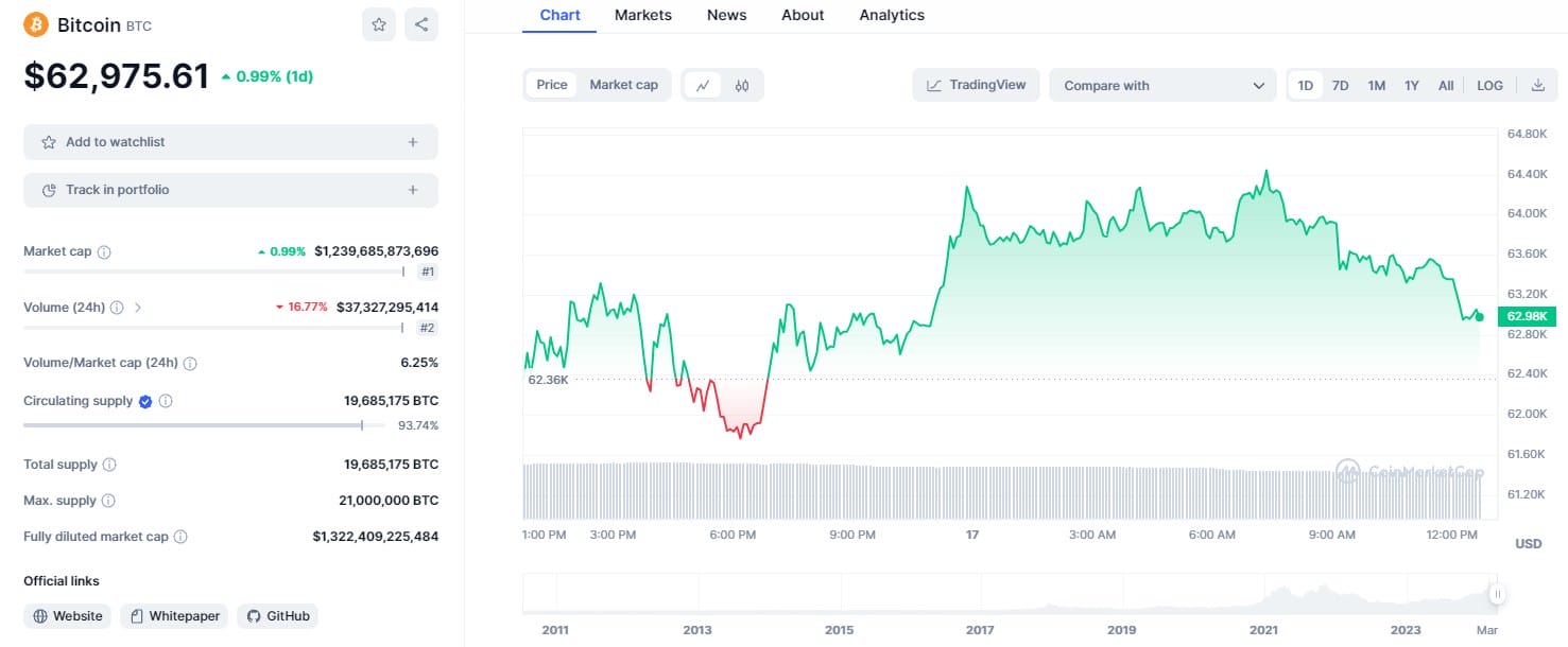 Come mostrano i dati di CoinMarketCap, al momento della stesura dell’articolo Bitcoin è scambiato a 62.975 dollari con un guadagno dello 0,99% nelle ultime 24 ore, che al momento conferma un andamento alquanto piatto.