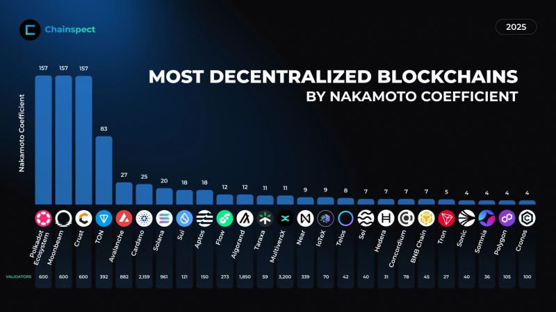 In cima alla classifica delle blockchain più decentralizzate spiccano Polkadot, Kusama e Moonbeam, con un coefficiente record di 157, seguite da Crust Network (83) e TON (27). Più indietro Avalanche (25) e Cardano (20), che rimangono tra le blockchain proof of stake più equilibrate.