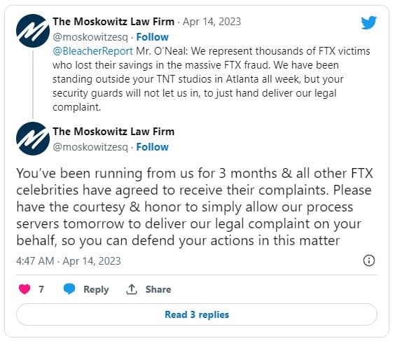O’Neal ha ricevuto i documenti legali per due cause distinte, una delle quali era la denuncia della class action intentata contro di lui e altre celebrità (tra cui Tom Brady) per il crollo di FTX.