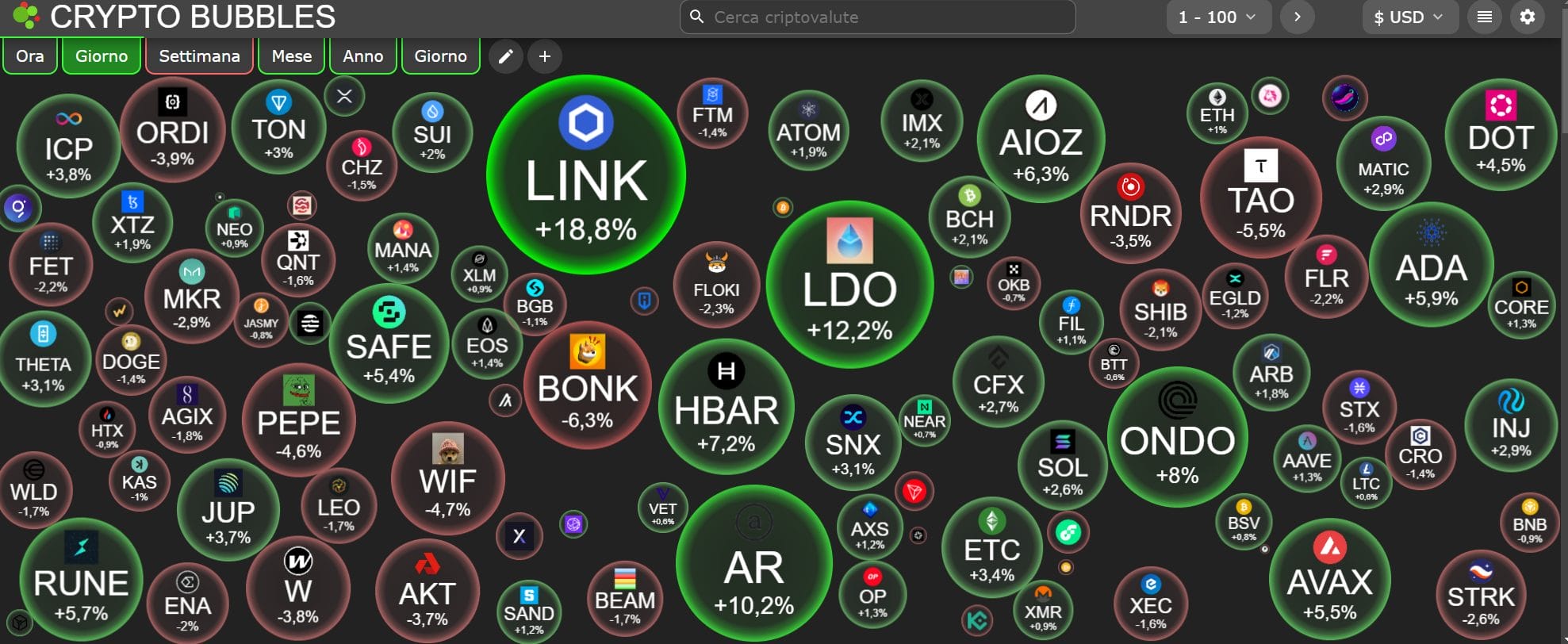 Guadagnano molto bene LINK, AR, LDO, HBAR, RUNE, ONDO e AVAX, almeno tra le prime 100 per capitalizzazione, mentre le altre sono per il momento ancora in rosso.