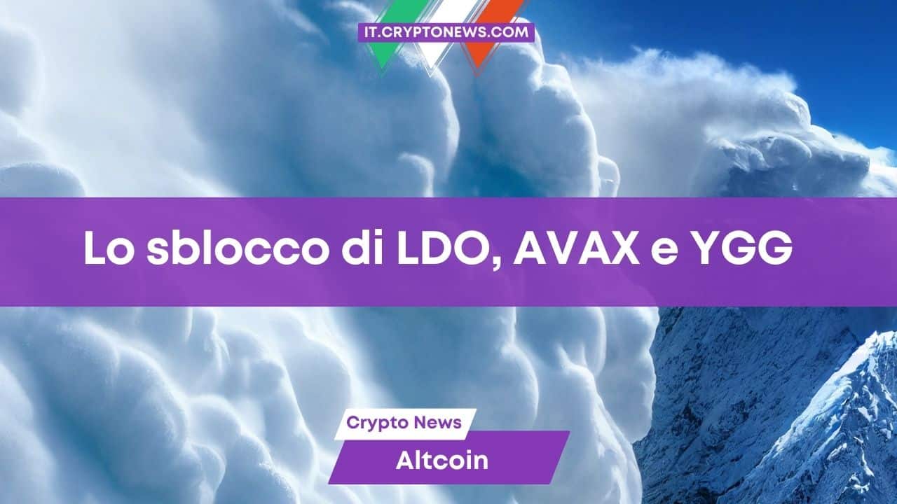 La prossima settimana verranno coniati e rilasciati sul mercato 115 milioni di token, l’unlock riguarda Avalanche (AVAX), il protocollo di staking liquido Lido (LDO) e infine DAO Yield Guild Games (YGG). L’impatto sul mercato sarà significativo con un’accresciuta offerta di token disponibili. Vediamo in dettaglio come funzionerà.